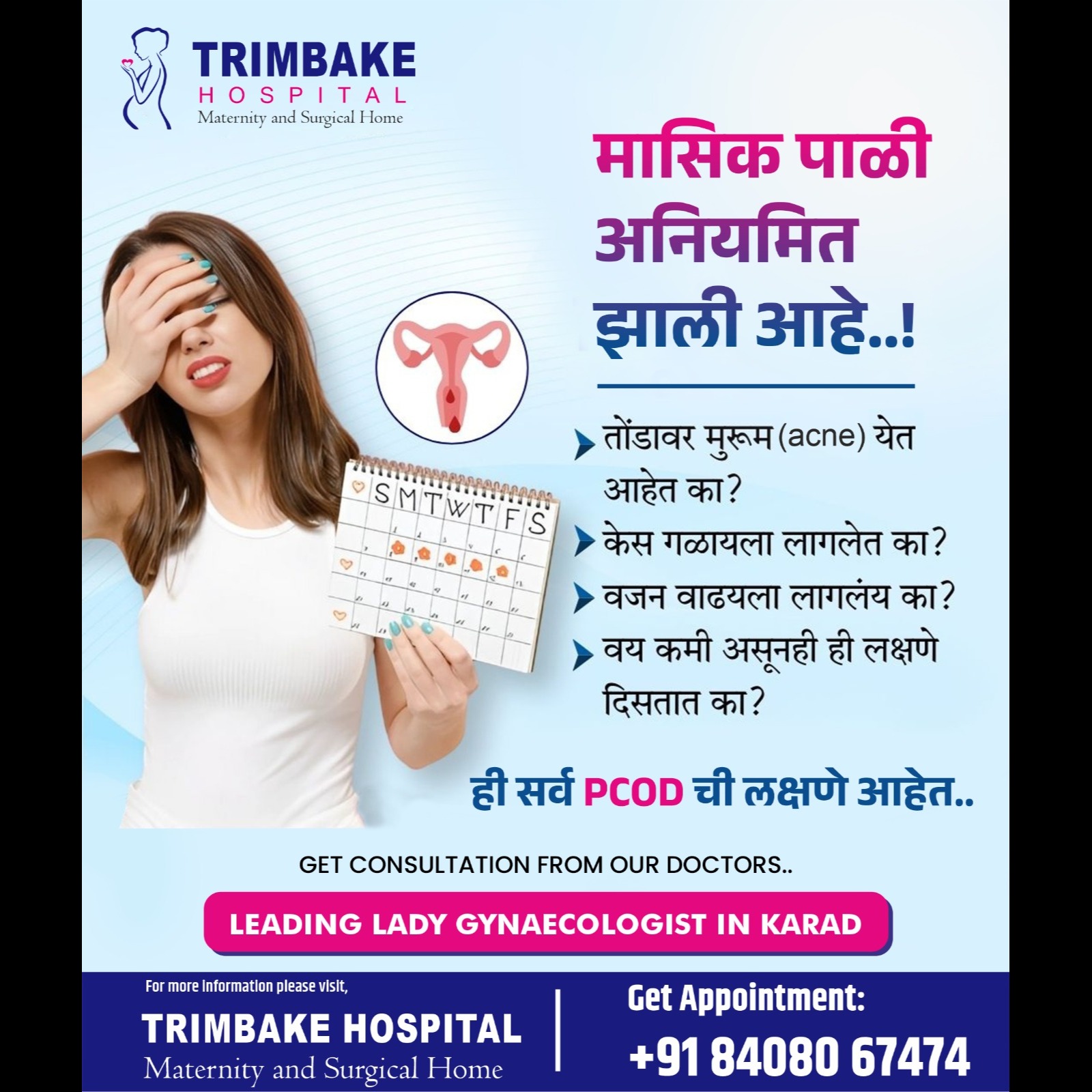 मासिक पाळी अनियमित झाली आहे? ❓ तोंडावर सतत मुरूम येत आहेत? ❓ केस जास्त गळत आहेत आणि पातळ होत आहेत? ❓ वजन अनपेक्षितपणे वाढत आहे? ❓ वय कमी असूनही ही लक्षणे दिसत आहेत का? 💡 ही सर्व लक्षणे PCOD (Polycystic Ovarian Disease) किंवा हार्मोनल असंतुलनाशी संबंधित असू शकतात. 📌 वेळीच योग्य निदान व उपचार घेणे आवश्यक आहे! 🔹 तज्ज्ञ डॉक्टरांचा सल्ला घ्या 🔹 योग्य आहार आणि जीवनशैलीचे पालन करा 🔹 त्वरित तपासणी करून समस्या वाढण्याआधीच उपाय करा ========= 📍 अधिक माहितीसाठी किंवा उपचारांसाठी आत्ताच संपर्क करा. त्रि॑बके हॉस्पिटल कॉटेज हॉस्पिटल जवळ, स्टेशन रोड, कराड संपर्क - +91 84080 67474