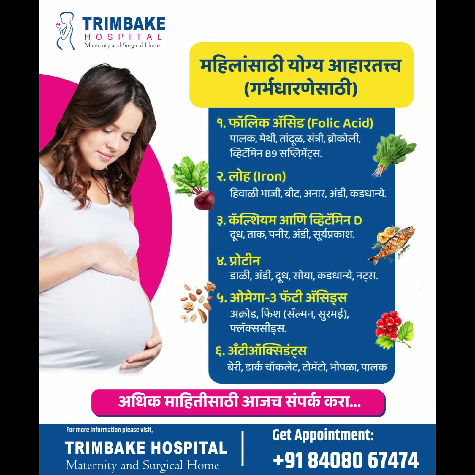 ЁЯТЦ рдЧрд░реНрднрдзрд╛рд░рдгреЗрдкреВрд░реНрд╡реА рдЖрдгрд┐ рдЧрд░реНрднрдзрд╛рд░рдгреЗрджрд░рдореНрдпрд╛рди рдпреЛрдЧреНрдп рдЖрд╣рд╛рд░ = рдирд┐рд░реЛрдЧреА рдмрд╛рд│ рдЖрдгрд┐ рд╕реБрджреГрдв рдЖрдИ! ЁЯд░ЁЯС╢ ЁЯМ┐ рдлреЙрд▓рд┐рдХ рдЕтАНреЕрд╕рд┐рдб, рд▓реЛрд╣, рдХреЕрд▓реНрд╢рд┐рдпрдо, рд╡реНрд╣рд┐рдЯреЕрдорд┐рди D, рдкреНрд░реЛрдЯреАрди, рдУрдореЗрдЧрд╛-3 рдЖрдгрд┐ рдЕрдБрдЯреАрдСрдХреНрд╕рд┐рдбрдВрдЯреНрд╕ рд╣реЗ рдкреЛрд╖рдХ рдШрдЯрдХ рдмрд╛рд│рд╛рдЪреНрдпрд╛ рд╡рд┐рдХрд╛рд╕рд╛рд╕рд╛рдареА рдЕрддреНрдпрдВрдд рдорд╣рддреНрддреНрд╡рд╛рдЪреЗ рдЖрд╣реЗрдд. тЬЕ рдпреЛрдЧреНрдп рдЖрд╣рд╛рд░ рдШреНрдпрд╛, тЬЕ рддрдЬреНрдЬреНрдЮ рдбреЙрдХреНрдЯрд░рд╛рдВрдЪрд╛ рд╕рд▓реНрд▓рд╛ рдШреНрдпрд╛, тЬЕ рдЖрдгрд┐ рдорд╛рддреГрддреНрд╡рд╛рдЪрд╛ рдкреНрд░рд╡рд╛рд╕ рдЖрдирдВрджрджрд╛рдпреА рдмрдирд╡рд╛! ЁЯТл ========= ЁЯУН рдЕрдзрд┐рдХ рдорд╛рд╣рд┐рддреАрд╕рд╛рдареА рдХрд┐рдВрд╡рд╛ рдЙрдкрдЪрд╛рд░рд╛рдВрд╕рд╛рдареА рдЖрддреНрддрд╛рдЪ рд╕рдВрдкрд░реНрдХ рдХрд░рд╛. рддреНрд░рд┐реСрдмрдХреЗ рд╣реЙрд╕реНрдкрд┐рдЯрд▓ рдХреЙрдЯреЗрдЬ рд╣реЙрд╕реНрдкрд┐рдЯрд▓ рдЬрд╡рд│, рд╕реНрдЯреЗрд╢рди рд░реЛрдб, рдХрд░рд╛рдб рд╕рдВрдкрд░реНрдХ - +91 84080 67474
